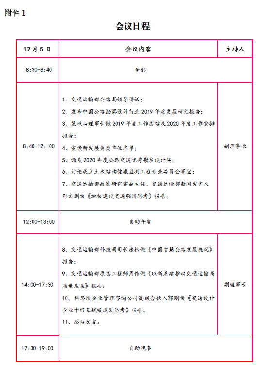 為加強勘察設計企業之間的交流溝通,中國公路勘察設計協會定于2020年12月4~5日在北京召開第六屆第六次理事會議。會議由中國公路勘察設計協會主辦,中交公路規劃設計院有限公司、中國公路工程咨詢集團有限公司、北京國道通公路設計研究院股份有限公司、北京交科公路勘察設計研究院有限公司、北京建達道橋咨詢有限公司協辦。現就有關事項通知如下: