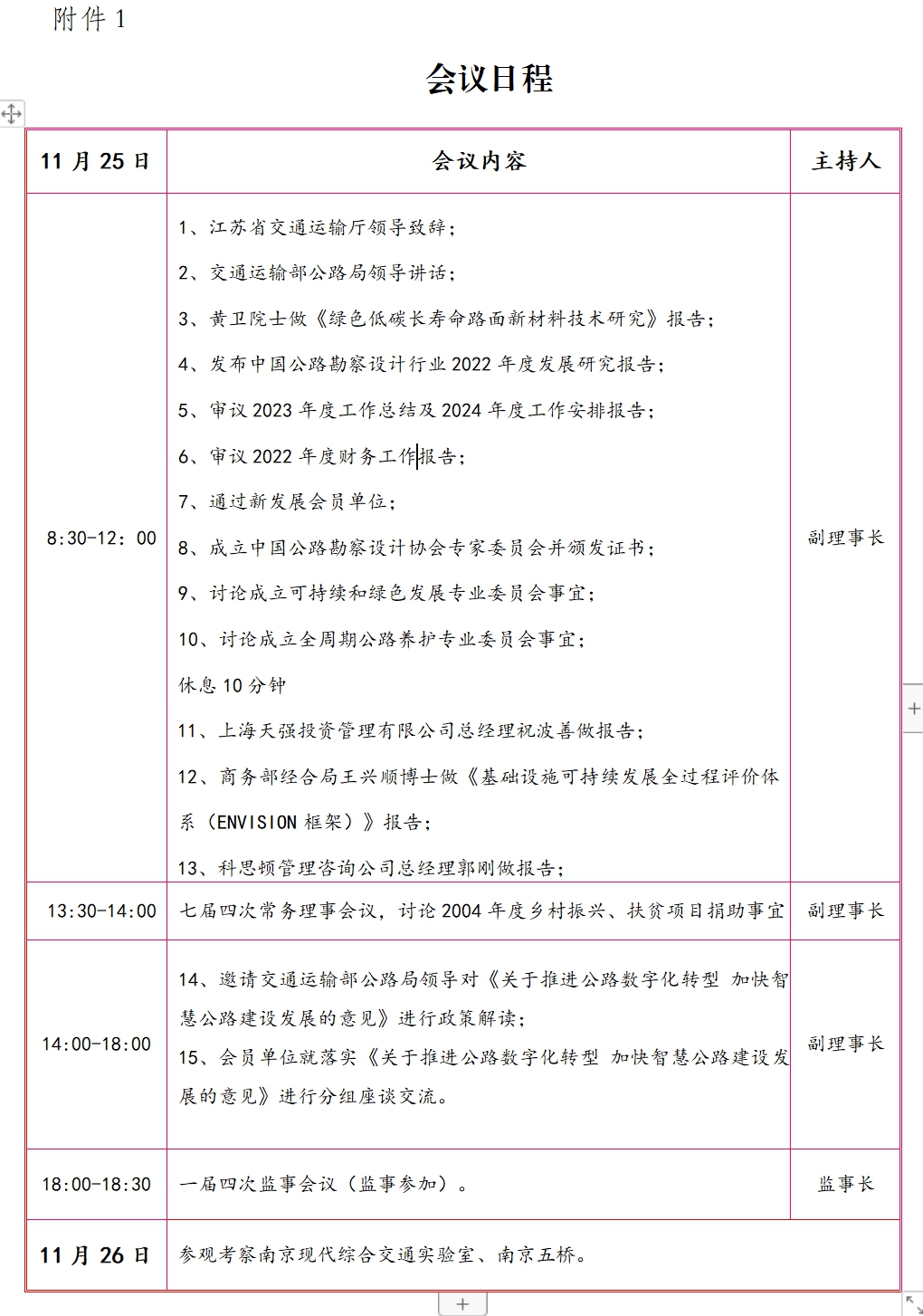 為加強公路勘察設計企業之間的交流溝通,中國公路勘察設計協會定于2023年11月24~26日在江蘇南京召開第七屆理事會第三次理事會議、第七屆理事會第四次常務理事會議、第一屆監事會第四次會議(監事參加)。現就有關事項通知如下: