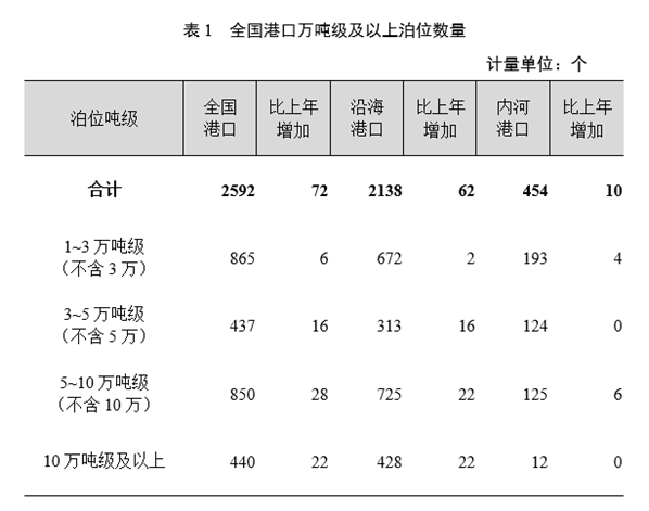 年末全國港口萬噸級(jí)及以上泊位2592個(gè),比上年末增加72個(gè)。其中,沿海港口萬噸級(jí)及以上泊位2138個(gè),增加62個(gè);內(nèi)河港口萬噸級(jí)及以上泊位454個(gè),增加10個(gè)。