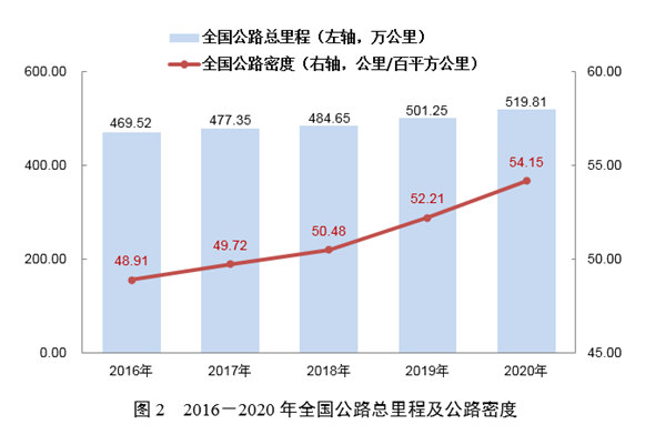 年末全國公路總里程519.81萬公里,比上年末增加18.56萬公里。公路密度54.15公里/百平方公里,增加1.94公里/百平方公里。公路養(yǎng)護(hù)里程514.40萬公里,占公路總里程99.0%。