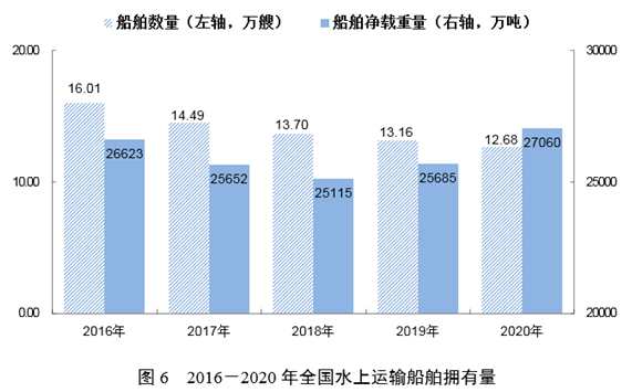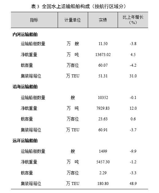 年末全國擁有水上運(yùn)輸船舶12.68萬艘,比上年末下降3.6%;凈載重量27060.16萬噸,增長5.4%;載客量85.99萬客位,下降2.9%;集裝箱箱位293.03萬標(biāo)準(zhǔn)箱,增長30.9%。
