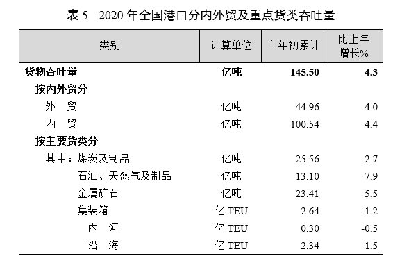 3.公報(bào)中營業(yè)性旅客運(yùn)輸量為鐵路、公路、水路、民航完成數(shù),不包括城市客運(yùn)量;營業(yè)性貨物運(yùn)輸量為鐵路、公路、水路、民航完成數(shù),不包括管道數(shù)據(jù)。根據(jù)2019年道路貨物運(yùn)輸量專項(xiàng)調(diào)查,對(duì)公路貨物運(yùn)輸量統(tǒng)計(jì)口徑進(jìn)行了調(diào)整,公路貨物運(yùn)輸量中“同比增速”基于調(diào)整后數(shù)據(jù)進(jìn)行計(jì)算。自2020年起,水路運(yùn)輸(海洋)統(tǒng)計(jì)方式由行業(yè)主管部門填報(bào)調(diào)整為企業(yè)聯(lián)網(wǎng)直報(bào),水路旅客運(yùn)輸量及水路貨物運(yùn)輸量中“同比增速”按可比口徑計(jì)算。