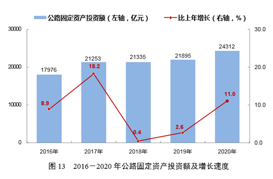 全年完成公路固定資產(chǎn)投資24312億元,比上年增長11.0%。其中,高速公路完成13479億元,增長17.2%;普通國省道完成5298億元,增長7.6%;農(nóng)村公路完成4703億元,增長0.8%。
