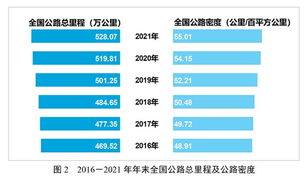 年末全國公路總里程528.07萬公里,比上年末增加8.26萬公里。公路密度55.01公里/百平方公里,增加0.86公里/百平方公里。公路養(yǎng)護里程525.16萬公里,占公路總里程比重為99.4%。