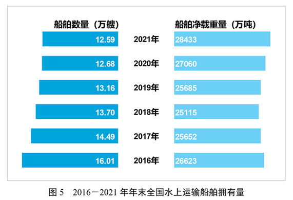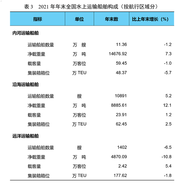 年末全國擁有水上運輸船舶12.59萬艘,比上年末下降0.7%,其中凈載重量28432.63萬噸、增長5.1%,載客量85.78萬客位、下降0.3%,集裝箱箱位288.43萬標準箱、下降1.6%。