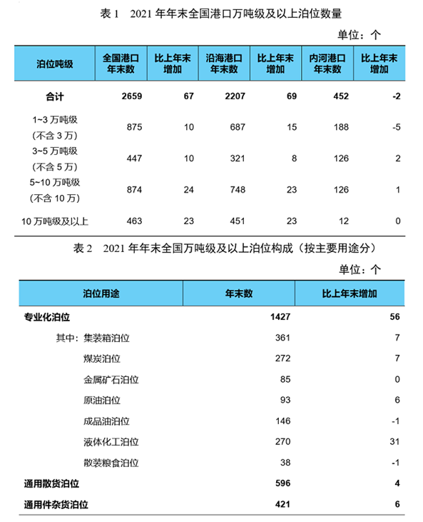 年末全國港口萬噸級及以上泊位2659個,比上年末增加67個。從分布結構看,沿海港口萬噸級及以上泊位2207個、增加69個,內河港口萬噸級及以上泊位452個、減少2個。從用途結構看,專業(yè)化萬噸級及以上泊位1427個、增加56個,通用散貨萬噸級及以上泊位596個、增加4個,通用件雜貨泊位421個、增加6個。